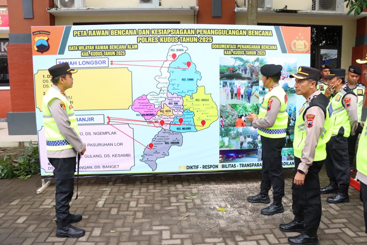 Dalam kesempatan tersebut, Kapolres Kudus juga menyoroti wilayah yang memiliki potensi bencana cukup tinggi, terutama banjir di Kecamatan Jati, Kaliwungu, Mejobo, Jekulo, dan Undaan, serta tanah longsor di Kecamatan Gebog dan Dawe.